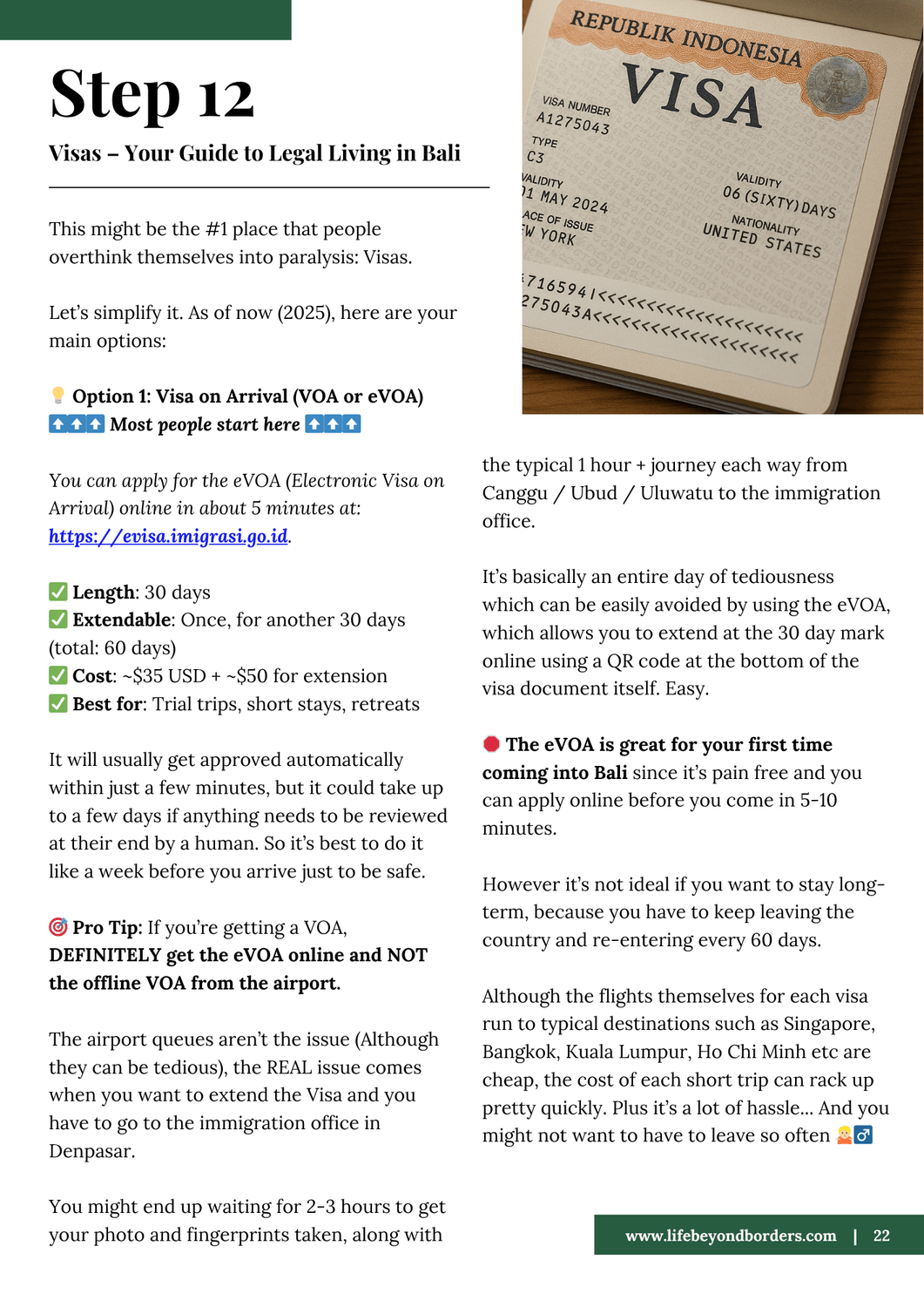 The information provided on this website and in the Bali Relocation Blueprint eBook is for general educational and inspirational purposes only. While every effort has been made to ensure accuracy, circumstances (including visa regulations, travel requirements, costs, and local laws) can change. You are strongly encouraged to verify any legal, financial, or logistical details with official sources and services before making decisions.